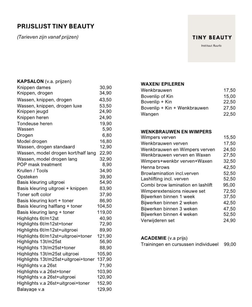 Behandelingen in de salon worden uitsluitend op afspraak aangeboden. Behandelingen kunnen online worden ingeboekt. Meer info? Bel naar: 0651677224, stuur ons een mail: info@tinybeauty.nl of loop gerust bij ons binnen!